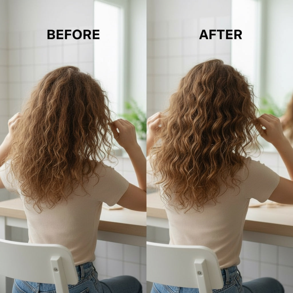 Laisse sécher à l’air libre ou utilise un diffuseur à basse chaleur. Les boucles se forment, deviennent plus défines et hydratées.