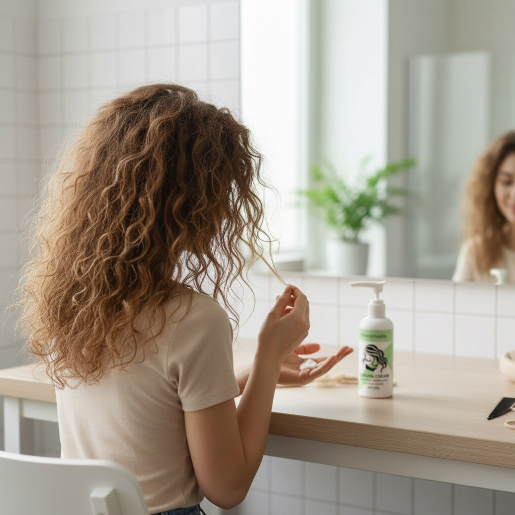 Passe la crème sur cheveux humides, mèche par mèche, en commençant par les longueurs puis les pointes. Scrunche doucement vers le haut pour activer les boucles.
